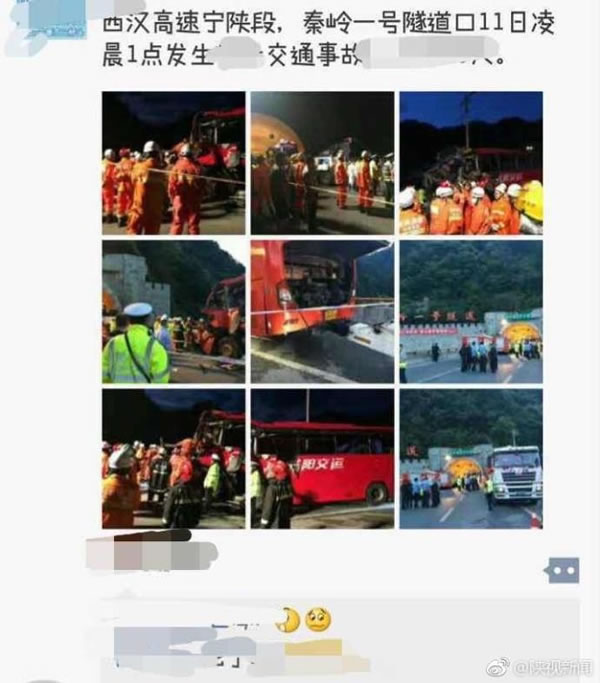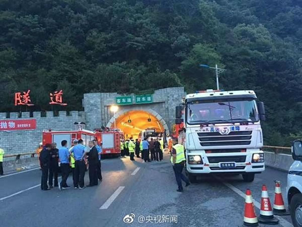 2017年8月10日23点34分,一辆号牌为豫C88858号客车(红色宇通客车,2011年12月19日出厂,检验有效期至2018年1月31日,机动车所有人为洛阳交通运输集团有限公司,核载51人,实载49人)自成都驶往洛阳,途经京昆高速公路西安方向秦岭一号隧道南口(1164km+930m),撞向隧道口发生交通事故。目前,自现场事故抢救出人员49人,其中36人死亡(成人34人,男26人,女8人,儿童男女共2人,受伤13人(已全部送往临近医院救治)。目前秦岭服务区B区和林场停车区临时交通管制,事故仍在处理当中。