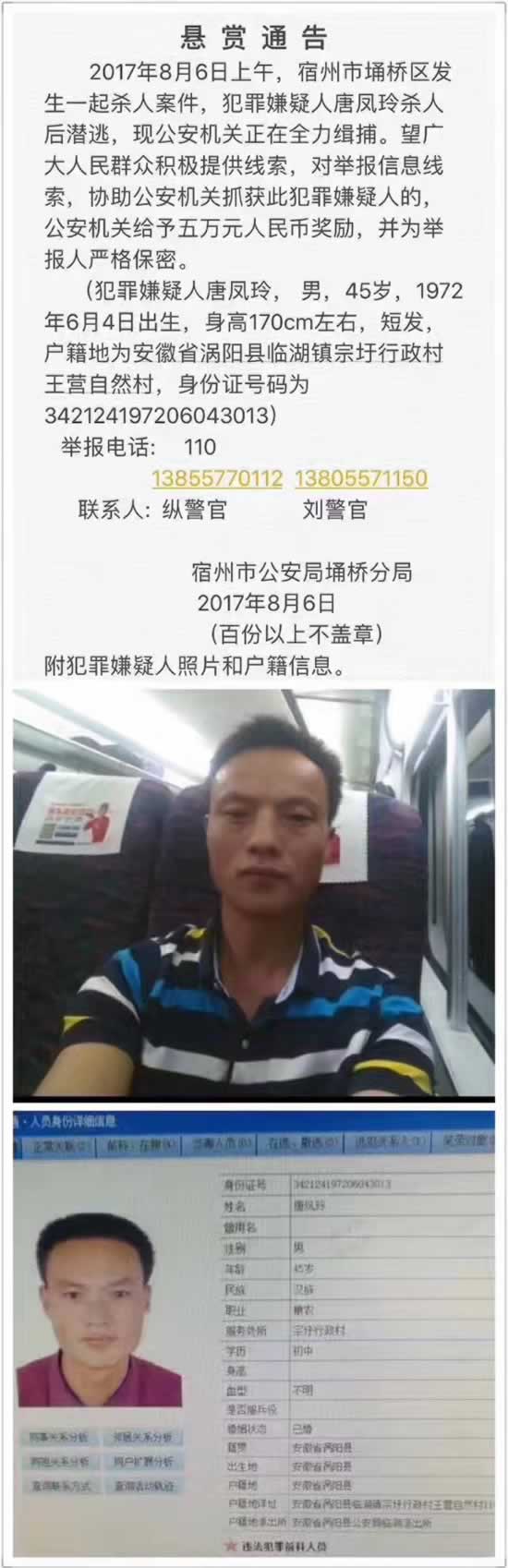 据警方多方调查,唐某玲因情感纠葛,8月6日在埇桥区西关杀害了前女友的丈夫和一个走亲戚的孩子,又在栏杆镇杀害了前女友的母亲。案发当天,当地警方悬赏五万元,搜捕唐某玲。8月8日,警方再度发布悬赏通告,并将悬赏金额变成十万元。唐某玲当日畏罪自杀。