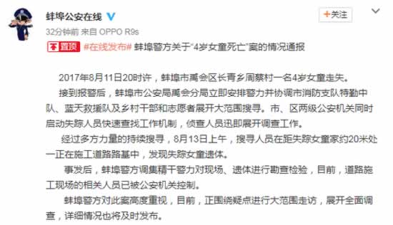 另据蚌埠警方:关于“4岁女童死亡”案的情况通报