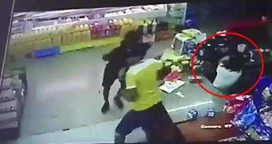 从视频中,可以看到正在营业的店铺内突然闯入了3名匪徒,其中看到2人持有手枪。据了解,另有1名匪徒在室外驾车接应。图中站在收银台的白衣女孩是遇害者潘紫莹,其余两人为匪徒。