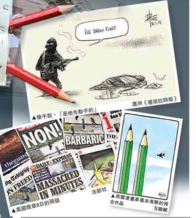 法国媒体8日都以黑色头版致哀,大喊“无法扼杀自由”,但对于是否刊登《查周》漫画则做法各异:保守派《费加罗报》没有刊登,小报《巴黎人报》则选择刊登。