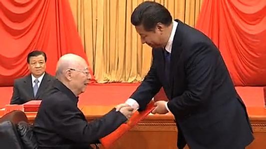 中共中央总书记、国家主席、中央军委主席习近平向获得2014年度国家最高科学技术奖的中科院院士、中国工程物理研究院高级科学顾问于敏颁发奖励证书。