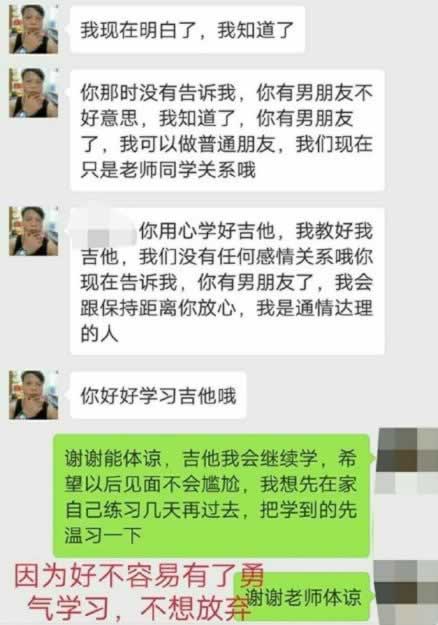 按照该女生公布在网上的聊天记录看,此女生之前已经和吉他老师说过了不希望继续被触摸。最后得到了辅导老师的承诺后才回心转意继续学习。