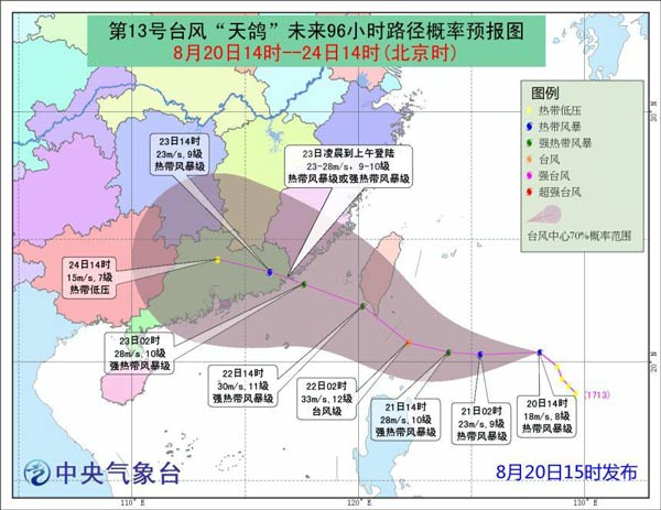 8月20日14时,今年第13号热带风暴"天鸽"已在台湾省鹅銮鼻东偏南方向约760公里的洋面上生成,风力8级(18米/秒)。预计未来将以每小时25公里左右的速度向偏西方向移动,强度逐渐加强,23日凌晨到上午在福建南部到广东东部沿海登陆。受其影响,22~25日,华南、西南东部、江南西部南部将有中到大雨,其中广东东部沿海和北部、福建南部沿海、广西北部、湖南南部、江西南部、贵州西部南部、四川中部南部等地将有暴雨,局部大暴雨。广东北江及东部沿海河流、福建南部沿海河流、广西柳江桂江上游、湖南湘江沅江上游、江西赣江上游、贵州乌江、四川岷沱江及嘉陵江等河流将出现明显涨水。