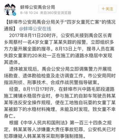 8月18日,蚌埠市公安局禹会分局发布了关于“四岁女童死亡案”的情况通报: