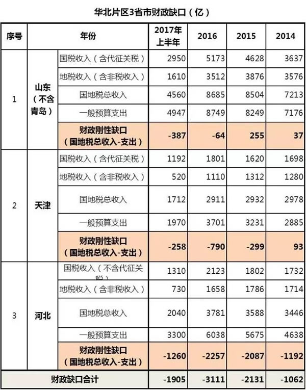 万万没想到,挂着“东部沿海省份”光环的山东、天津和河北居然都在亏钱。GDP排名第三的山东居然在2016年丧失了财政独立能力,开始向中央伸手要钱。2016年只亏了64亿元,2017年才过了一半就亏了387亿元,这就像大坝决堤,一发不可收拾。顺带说一句,青岛在行政上隶属于山东,但在财政上却不归山东管。山东省经济发展不平衡,临沂革命老区的包袱太重了。严重依赖外贸的胶东地区也陷入了瓶颈期。