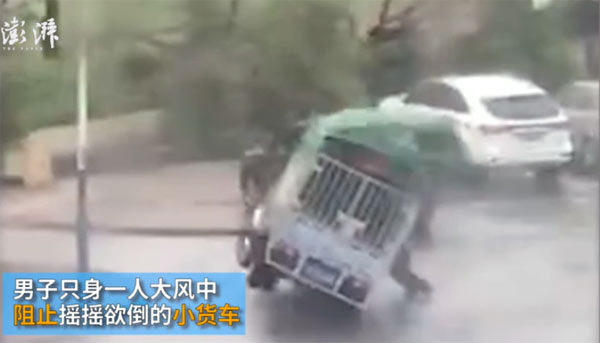 8月23日,广东中山。一男子在大风中双手抵住自己的货车,试图将车撑住。但因风力太大,货车被吹翻将男子压在车身下。坦洲镇政府宣传科工作人员称,该男子不幸当场身亡。