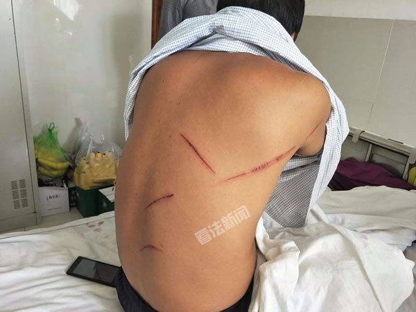8月28日下午,记者在河北省廊坊市香河县的一家医院内见到了伤者张先生,他正躺在病床上休养,旁边坐着他的爱人杨女士。张先生的手臂受伤较重,还缠着一大圈纱布,他不敢随意动弹。杨女士掀开丈夫后背上的衣服之后,露出了五道血痕,已经结痂。