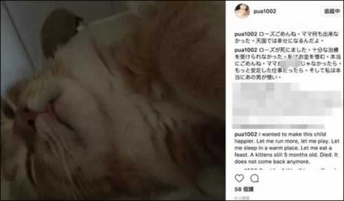 她上传了猫死去的照片并写道:“对不起啊罗斯(猫的名字),妈妈什么都不能做,在天国要幸福啊”,“罗斯死了,没有接受完好的治疗,我恨金钱。真的对不起啊,如果妈妈不是干这一行,如果我有更稳定的工作的话,你可能就不会死了。而且,我真的好恨那个男人。”