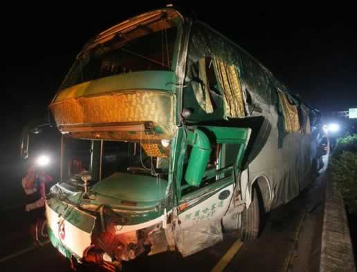 台湾1号高速中山高北上348公里冈山交流道附近11日晚间近12点发生重大车祸,1辆阿罗哈客运车疑因闪避前方车辆不慎失控沿路擦撞中央分隔岛护栏,造成乘客被抛飞车外共6死11伤,车体毁损变形,警消据报赶往抢救,肇事原因仍待调查。(王锦河摄)图片来源:台湾《中时电子报》