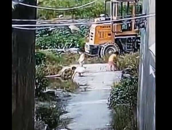 3名幼童独自在溪边玩耍,02:43分,1名幼童落水,02:56分,第2名幼童落水,03:03分 第3名幼童落水,随后水面溅起水花,看似是幼童在水里挣扎。幼童被打捞出水面