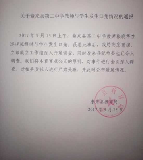 据其介绍,此事发生在9月15日上午,泰来二中副校长张晓华在巡视教室过程中,和一名初二年级的男生发生口角。当事学生已经被批评教育,张晓华已被县纪委处以严重警告处分,同时免去副校长职务,调离泰来二中。