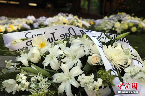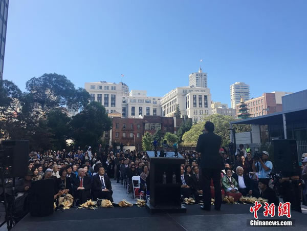 当地时间9月22日,美国旧金山市圣玛丽广场,慰安妇雕像揭幕仪式隆重举行,这也是美国主要大城市第一座慰安妇雕像。图左为89岁的韩国慰安妇幸存者李荣洙。中新社记者 刘丹 摄