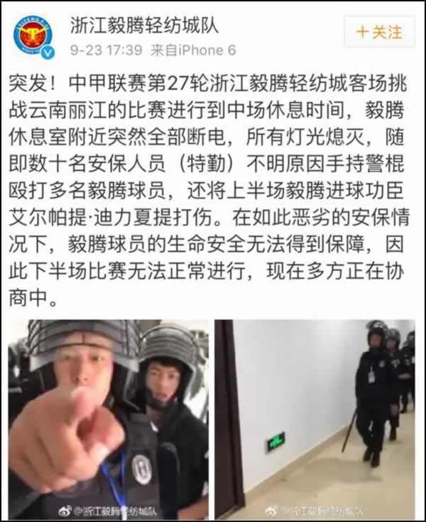 中场休息时,又曝出更衣室保安打人事件。浙江毅腾官方微博发文称:毅腾休息室灯光突然熄灭,数十名安保人员持警棍殴打毅腾进球球员艾尔帕提·迪力夏。