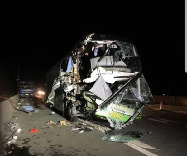 旅游巴车头严重损毁,车厢内血渍斑斑,消防员和医护人员登车抢救,现场停泊大批救护车。