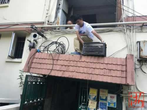 2017年夏季,陈浩爬到单元门上平台,搬运线路维修工具。社区供图