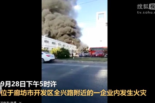 9月28日下午5时许,位于廊坊市开发区全兴路附近的一企业内发生火灾,现场浓烟滚滚并伴有爆炸声。