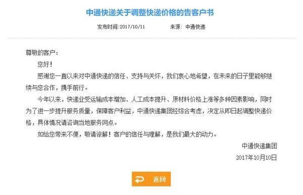 昨天(10月10日),中通快递官方宣布,今年以来,快递业受运输成本增加、人工成本提升、原材料价格上涨等多种因素影响,同时为了进一步提升服务质量,保障客户利益,中通快递集团经综合考虑,决定从即日起调整快递价格,具体情况请咨询当地服务网点。