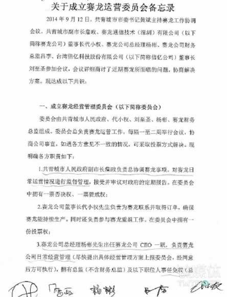成立赛龙经营管理委员会备忘录,詹政为代表的政府全面接管赛龙系公司,董事长代小权被彻底架空。
