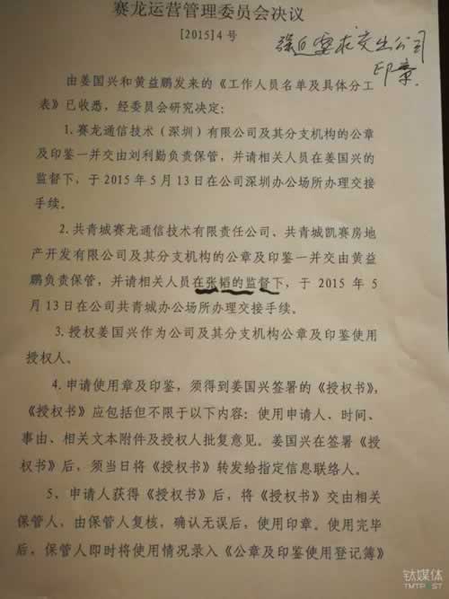 赛龙经营管理委员会对收取赛龙系公司公章的决议