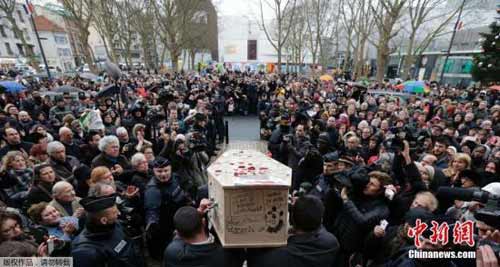 当地时间2015年1月15日,法国蒙特勒伊,《查理周刊》杂志的同事亲友在遇难的卡通画家Bernard Verlhac(又名:Tignous)的棺材上画画。人们为遇难的漫画家举行葬礼。