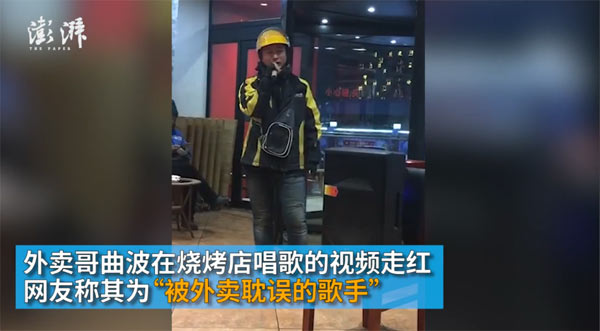 近日,黑龙江哈尔滨。外卖员曲波在烧烤店唱歌的视频走红,被赞“被外卖耽误的歌手”。7日曲波对澎湃新闻表示唱歌并非炒作仅是业余爱好,暂时也没考虑转行,会继续送外卖。