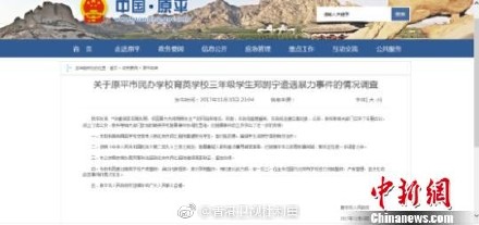 10日,事发地山西省原平市政府表示介入该事件并展开调查。10日深夜,原平市政府发布《关于原平市民办学校育英学校三年级学生郑剀宁遭遇暴力事件的情况调查》。(以下简称《调查》。)