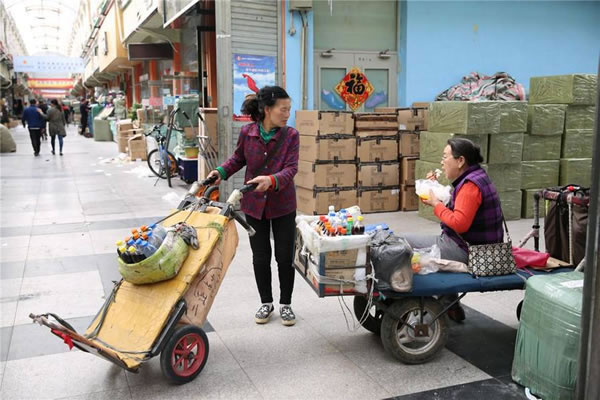 这位大妈今年55岁,她正在为两名蒙古国旅客拉货,从温州商城到顾客居住的宾馆有500米的距离,由于货物比较多还很重,这一趟大妈要价10块钱,顾客也没有还价,她说每天像这样的“大活”并不多。