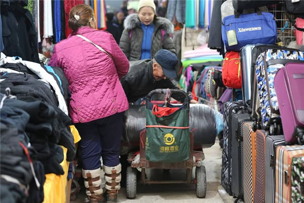 蒙古国旅客每次来中国进货买的东西很多,逛的时间很长,经常来的会自己带个小推车方便拉货。没带车的旅客买上部分货物后,就叫拉货的将物品装到小车上,这样的活1小时收费10元。图为一位上了年纪的大叔将货物装到推车上。