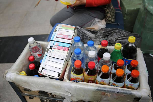 图为大妈们卖的饮料和蒙古国香烟。