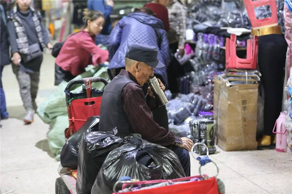 在商场内拉货的老人年龄普遍在60岁以上,这位大叔已经70多岁了,为了省钱他们中午一般不吃饭,水也从家里带。