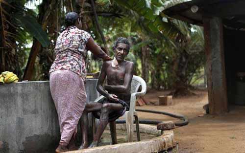 2013年7月16日,患有慢性肾脏疾病的斯里兰卡农民Kumaradasa,正在妻子的帮助下洗澡。(图片来源:美国媒体)