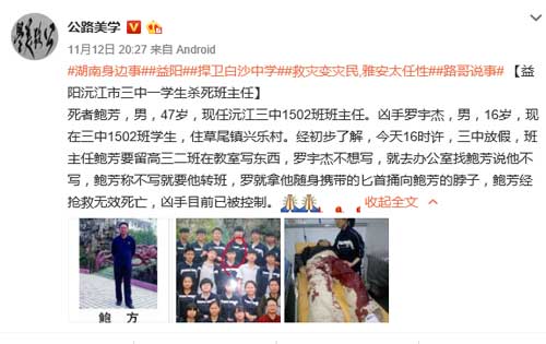 事发后,微博上,不少曾在沅江三中读过书的学生,特别是被死者鲍某教过的学生,一直在回应着网友对老师和母校的攻击。