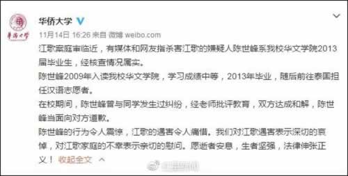 11月14日下午,华侨大学官微也回应了陈世峰在学校的纠纷。“在校期间,陈世峰曾与同学发生过纠纷,经老师批评教育,双方达成和解,陈世峰当面向对方道歉。” 并称,陈世峰2009年入读该校华文学院,学习成绩中等,2013年毕业,随后前往泰国担任汉语志愿者。