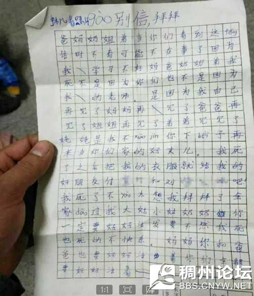 据《新京报》我们视频显示,女孩在去世前疑似留下一则告别视频和两页遗书。遗书中表示“爸妈奶姐弟,当你们看到这封信时我可能已经不在世了”,“我的死不是因为你们也不是因为老师,而是因为我自己”,“你也不用天天打我骂我了,你骂的时候我特别开心”,“因为我太想去天上看看了,拜托了再见了”。