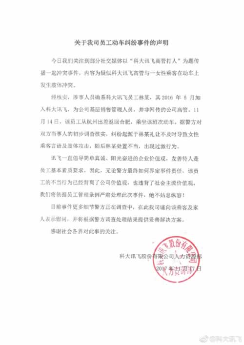 原标题:科大讯飞高管高铁上暴打女子?公司回应:普通员工