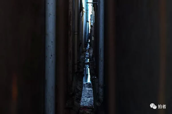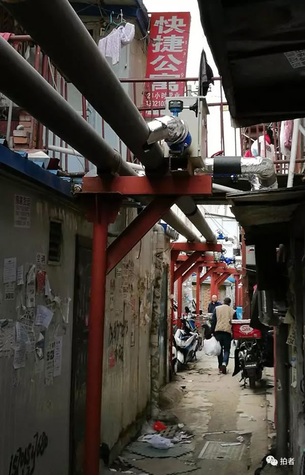 大兴区新建村,村中的楼房中间布满了排水管道,排水渠散发出恶臭。