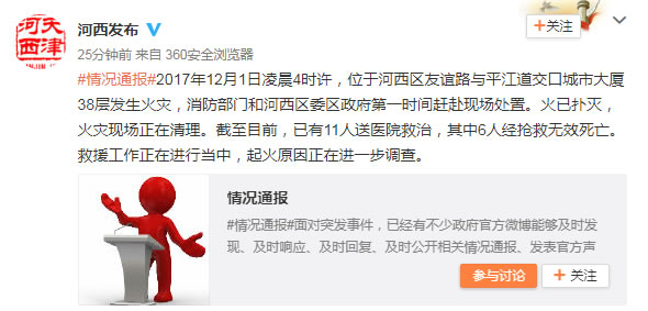 2017年12月1日凌晨4时许,位于河西区友谊路与平江道交口城市大厦38层发生火灾,消防部门和河西区委区政府第一时间赶赴现场处置。火已扑灭,火灾现场正在清理。截至目前,已有11人送医院救治,其中6人经抢救无效死亡。救援工作正在进行当中,起火原因正在进一步调查。