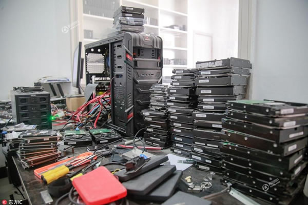 红波的工作室在西安一个电脑城的15楼,架子上放满了硬盘,基本上都是客户送来的坏盘,数据恢复后,坏掉的硬盘就没用了,越堆越多。