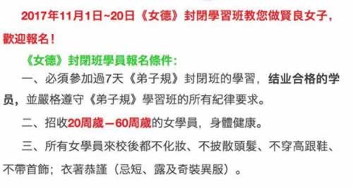 9月29日,网站发出一则名为“11月1日《女德》班開始報名了!”的通知,招生内容是这样的: