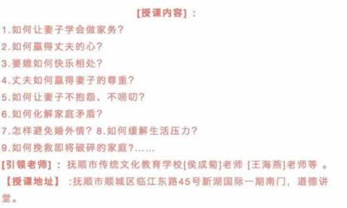 不知道这期招来的是不是就是视频中的那批学员,因为首页上还以“好消息”加3个叹号的题目提醒学员,有一门与女德内容非常类似的《夫妻和睦从这里开始》课程也在同一时间开课了,主要的知识点有: