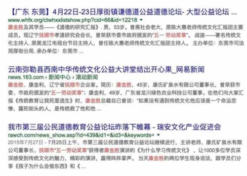 而康金胜在他的“大无赖变成大善人”视频中说,他曾经是经常砍人、抢劫的黑社会,经《弟子规》感化好之后,后来当上了康氏矿泉水有限公司董事长,还曾荣获市委市政府颁发的“五一劳动奖章”。这剧情,可以说是14K元老洪汉义改邪归正传奇的大陆版了。