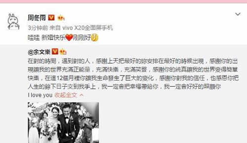 当然,之前余文乐说过自己和周冬雨不是同一种性格的,也许和‘皮带千金’王棠云的性格相符吧。不过,周冬雨还是对曾经扮演的男朋友表示了祝福,这‘哇哇 新婚快乐 刚刚好’9字让人遐想翩翩啊!