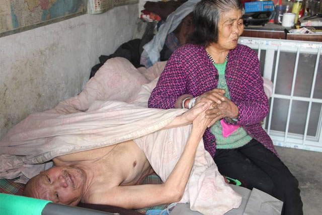 今年82岁的马应山家住河南郑州淮河岸边,六年前因突发脑梗导致瘫痪卧床,这一躺就再也无法起来,吃喝拉撒全在床上,生活全靠老伴儿李明兰照顾,妻子李明兰小时候家庭贫穷,从小靠放牛为生,温饱都是问题,更没钱读书,至今只会写自己的名字,遇到马应山时,他还是个靠捡垃圾、拾荒乞讨为生的穷小子,但善良的李明兰却不嫌弃他,与他结为了夫妻。“他那时候乞讨要饭,我就跟着他一起乞讨要饭。”