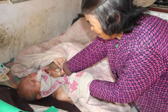 家中只靠政府每个月补贴的养老金维持生计,没有其他收入,更没有钱给卧床的老伴儿买纸尿垫,“一天喂他两顿饭,怕他不消化,容易胀气,一天要给他换尿布五六次”,家门口到处可以看到晾晒的尿布,这些都是村里乡亲们送的破布,即使是洗过后看着也是破烂不堪。