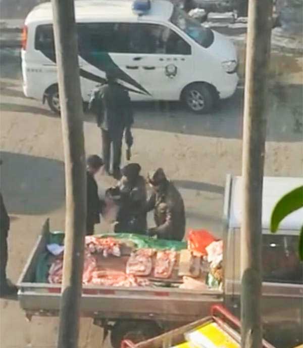 近日,一则视频在网上流传。视频显示,在一卖肉的流动摊贩前,几名身穿制服的男子在摊主面前比划了一番,随后摊主用一只塑料袋包好一大块肉,递给其中一名男子,男子拿走包好的肉走上执法车,并没有上称和付款。该视频引发热议,网友质疑身穿制服的男子为城管。