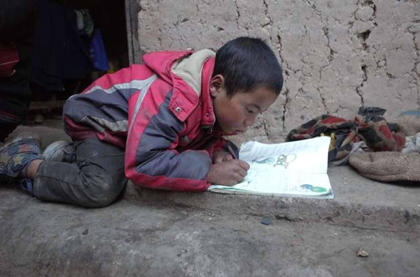 当地的人告诉笔者,除了喝凉水,如果你看到有些孩子穿拖鞋来上学,可能就是河对岸山上的,这些孩子还在要冬天也要蹚水过河,把脚伸进刺骨的冷水。而有些孩子回家的山路,一走可能就需要两三个小时。图为一户人家的房檐下,一位学生趴在地上写作业,小男生用不太顺畅的普通话告诉笔者:现在好好读书,以后就能走出大山。