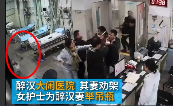 12月13日,江苏镇江。一醉汉陪其妻子在医院输液,与保安发生肢体冲突。醉汉妻子欲上前拉架,护士举着吊瓶跟在其身后。后经警方协调,醉汉赔偿各方损失共1.6万元。