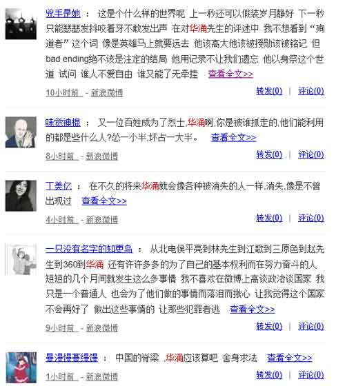 网友@一只没有名字的知更鸟: 从北电侯平亮到林先生到江歌到三原色到赵先生到360到华涌 还有许许多多的为了自己的基本权利而在努力奋斗的人 短短的几个月间就发生这么多事情 我不喜欢在微博上高谈政治谈国家 我只是一个普通人 也会为了他们做的事情而落泪而揪心 让我觉得这个国家不会再好了 做出这些事情的 让那些犯罪者逃