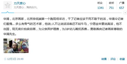 据腾讯网友·@力天度心 12月3日消息称:华涌,北京画家,北京排低端第一个跑现场采访,干了记者应该干而不敢干的活,华涌令记者们羞愧… 多么有骨气的艺术家,他说:人不让说话活着还不如牛马,宁愿坐牢要说真话,他不出国,现无底价拍卖自画,为父亲弄护理费,为3岁幼儿筹抚养费… 勇敢善良记者画家尊敬的华涌先生。